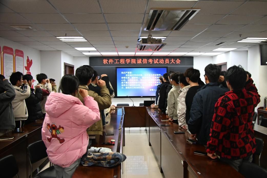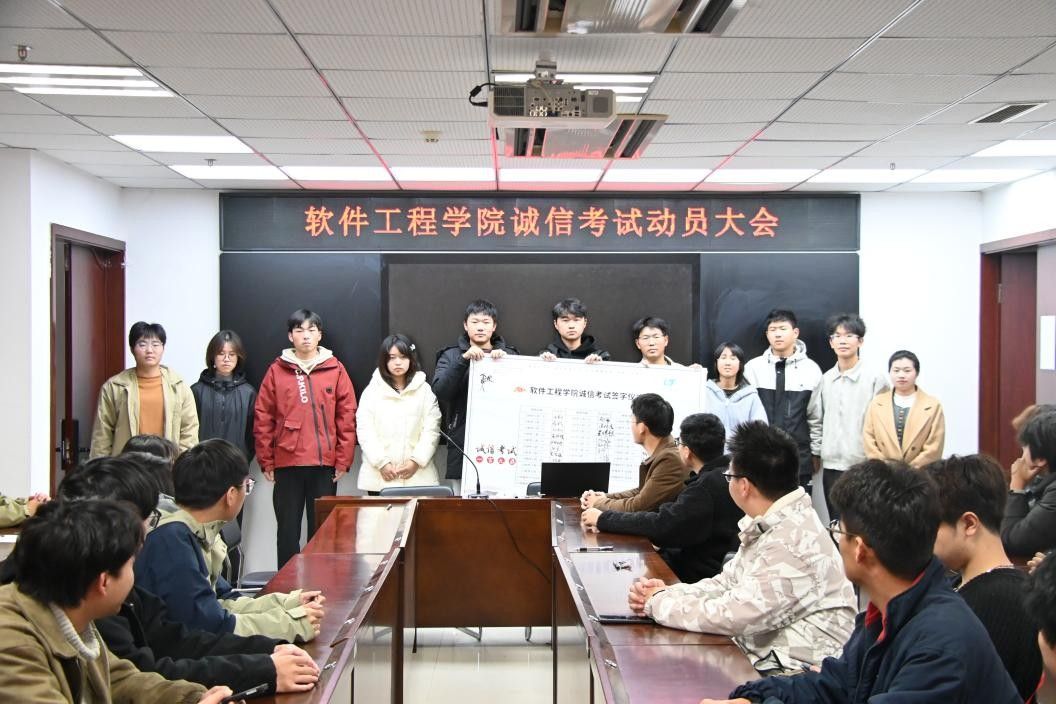 辅导员王天宇老师针对即将到来的全国大学英语四六级考试进行了考务指导与答题规范说明,他提醒同学们备齐考试相关物品,考试过程中保持平稳心态,严格遵守考场纪律,以真实水平应考,共同维护考试环境的公平与秩序。会议最后,全体学生庄严宣誓,承诺自觉遵守考试纪律,诚信应考,并在"诚信考试承诺书"上郑重签名。