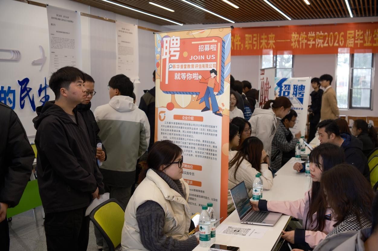 为搭建校企人才对接桥梁,助力毕业生高质量就业,2026年3月26日下午软件学院2026届毕业生专场招聘会在江宁校区大学生活动中心一楼招聘大厅圆满落幕。本次招聘会邀请南京联迪、南京迈特望等15家优质企业参会,涵盖软件研发、信息技术等多个领域,为毕业生提供了丰富就业选择。