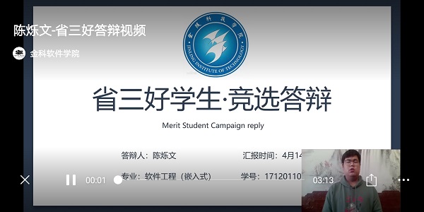 由于疫情影响,本次活动创新地采取线上答辩及投票评分的形式,在学院微信公众号上传候选人的推荐答辩资料,由各年级学生代表及学联主要学生干部进行线上投票选举、结合学院老师评分确定最终候选人。本次共有6候选人竞选省级三好学生优秀学生干部,他们都是软件优秀学子代表。经过一系列精彩的答辩选举活动后,最终确定推荐张倩楠同学为2020年度省级三好学生候选人,陈烁文同学为2020年度省级三好学生候选人,17软件工程嵌入式(1)班为2020年度省级先进班集体。