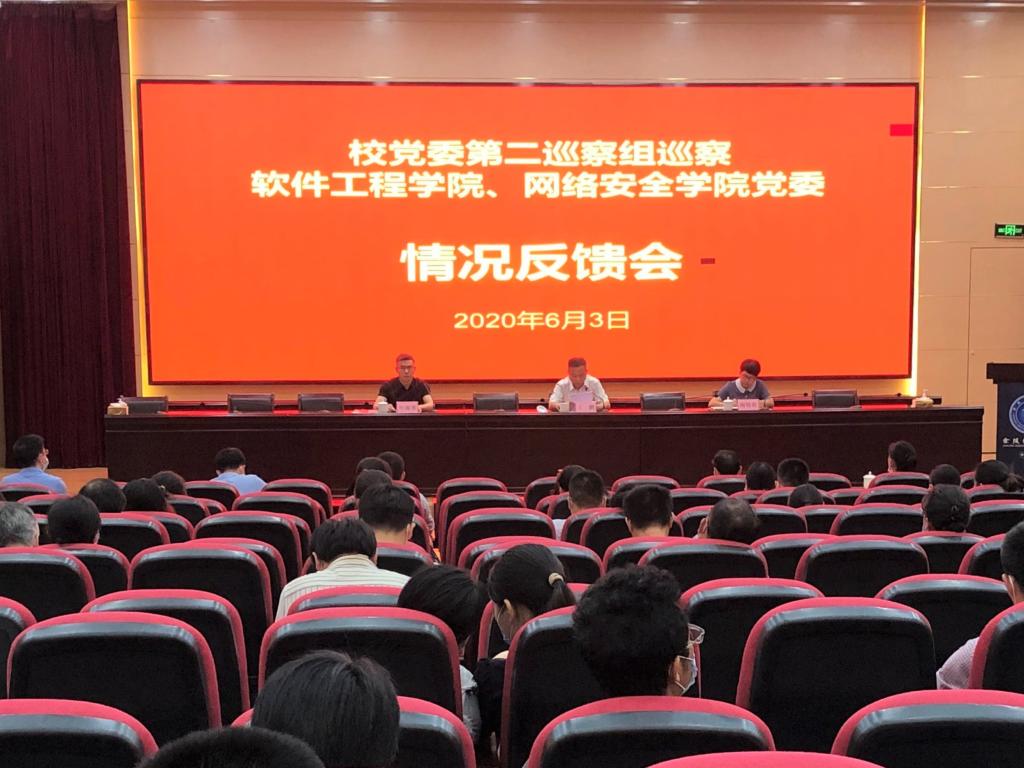 2020年6月3日,校党委第二巡察组在科技楼报告厅向太阳集团tyc539macau、网络安全学院党委反馈校内巡察情况,校党委第二巡察组组长、纪委书记丁鹏代表校党委巡察组向太阳集团tyc539macau、网络安全学院党委领导班子进行了反馈,学院党委书记叶海青同志主持会议并作表态发言。