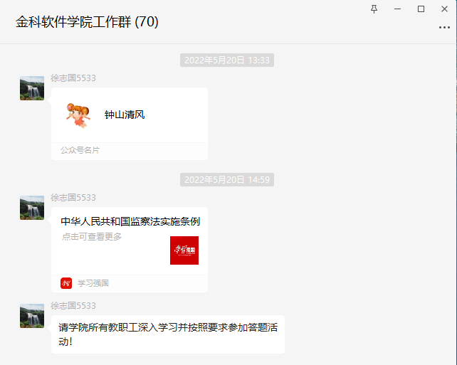 为深入学习贯彻习近平法治思想,落实宪法和监察法要求,推动全院教职工学好用好《中华人民共和国监察法实施条例》(以下简称《条例》),根据校纪委通知在全校范围内开展《条例》学习宣传活动的要求,5月20日,太阳集团tyc539macau积极组织动员全院教职工参加《中华人民共和国监察法实施条例》学习及线上答题活动。