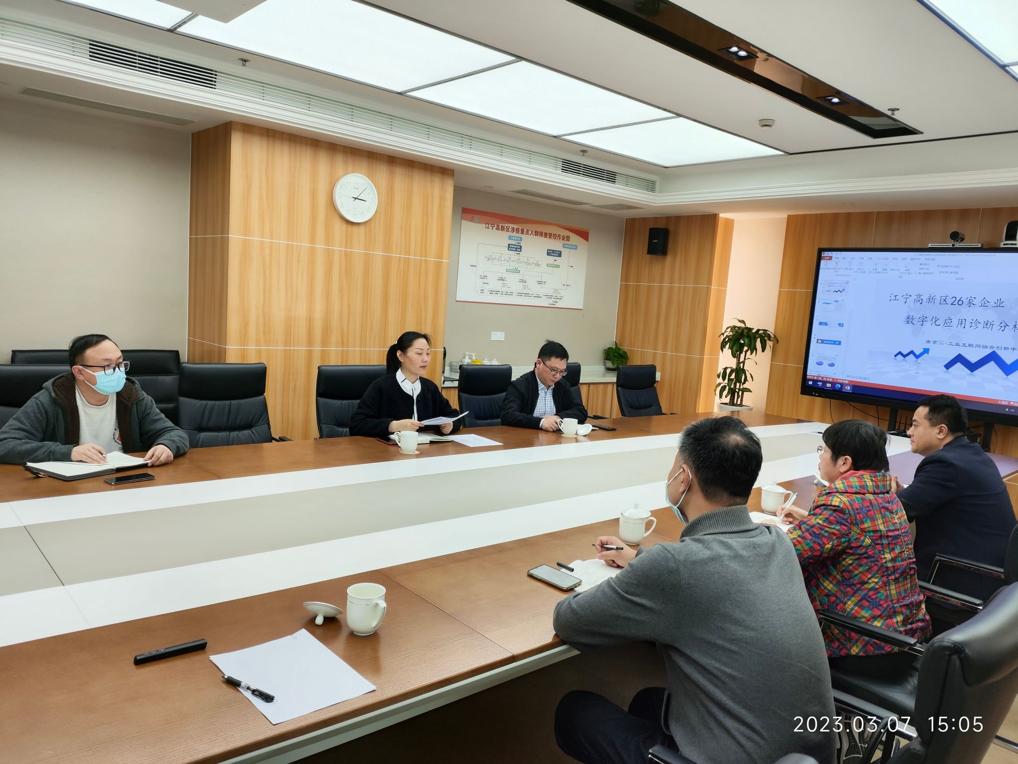 2023年3月7日下午,南京5G+工业互联网融合创新中心(以下简称“融创中心”)主任、太阳集团tyc539副校长张燕,合作单位中国联通南京市分公司江宁区总经理宋桂宁一行,前往江宁高新区向江宁高新区管委会副主任李娟、江宁高新区经济运行部部长夏欢等领导汇报园区参诊企业数字化应用情况。