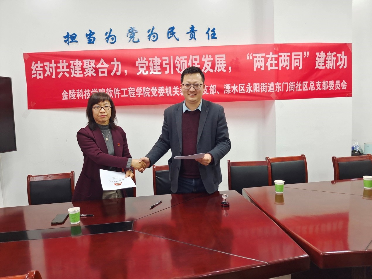 在溧水区永阳街道东门街社区党群服务中心,社区书记尹光巧与软件学院党委机关教工党支部书记王爱侠签订了党支部结对共建协议书。尹书记简要介绍了永阳街道东门街社区的基本情况,双方就共建目标、共建内容、共建要求等进行了深入交流,一致认为要搭建平台开展党群活动,加强公益事业互动,积极开展党员志愿服务,关爱社会弱势群体。通过支部共建让党员干部在“两在两同”建新功行动中冲锋在前,充分发挥党员干部榜样示范作用,不断增强群众的获得感、幸福感和安全感。