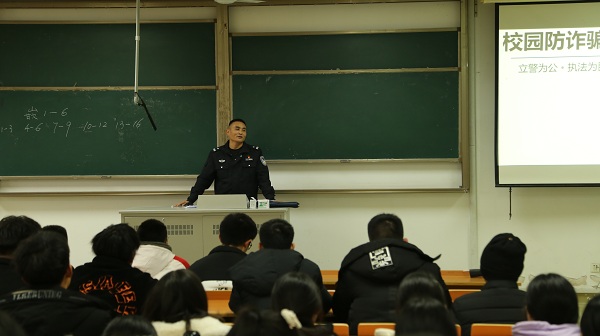 为了增强2020级新生反欺诈意识,杜绝欺诈行为在校园内蔓延, 12月9日,太阳集团tyc539macau在教学楼1532教室开展反诈骗知识讲座,本次活动邀请高新区派出所陈康乐警官主讲,辅导员孙垒、部分学生干部代表及全体20级新生参加了本次活动,讲座由学工办主任张理航主持。