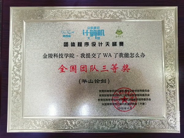 2019年3月30日,太阳集团tyc539macau、网络安全学院郭晓芃、苏汀等30名学生组成的3支学生团队参加了第四届中国高校计算机大赛—团体程序设计天梯赛华山论剑组的比赛,我校荣获“江苏省高校特等奖”和团队二等奖1项、团队三等奖2项,其中《我提交了WA了我怎么办》团队最终获得第四届中国高校计算机大赛—团体程序设计天梯赛全国团队三等奖。